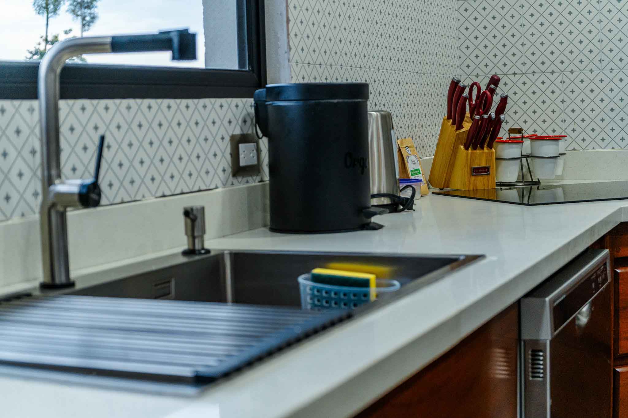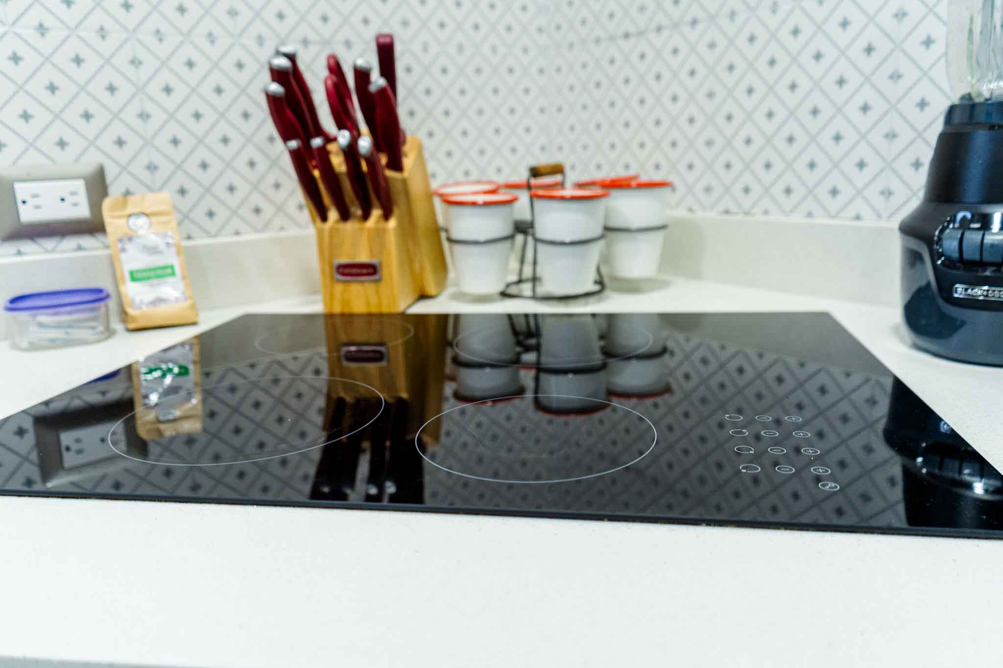 Baking tray. Coffee maker. Coffee. Wine glasses. Kettle. Oven. Dishwasher. Blender. Mini fridge. Plates and cutlery. Refrigerator. High chair. Toaster. Basic cooking utensils. Barbecue utensils