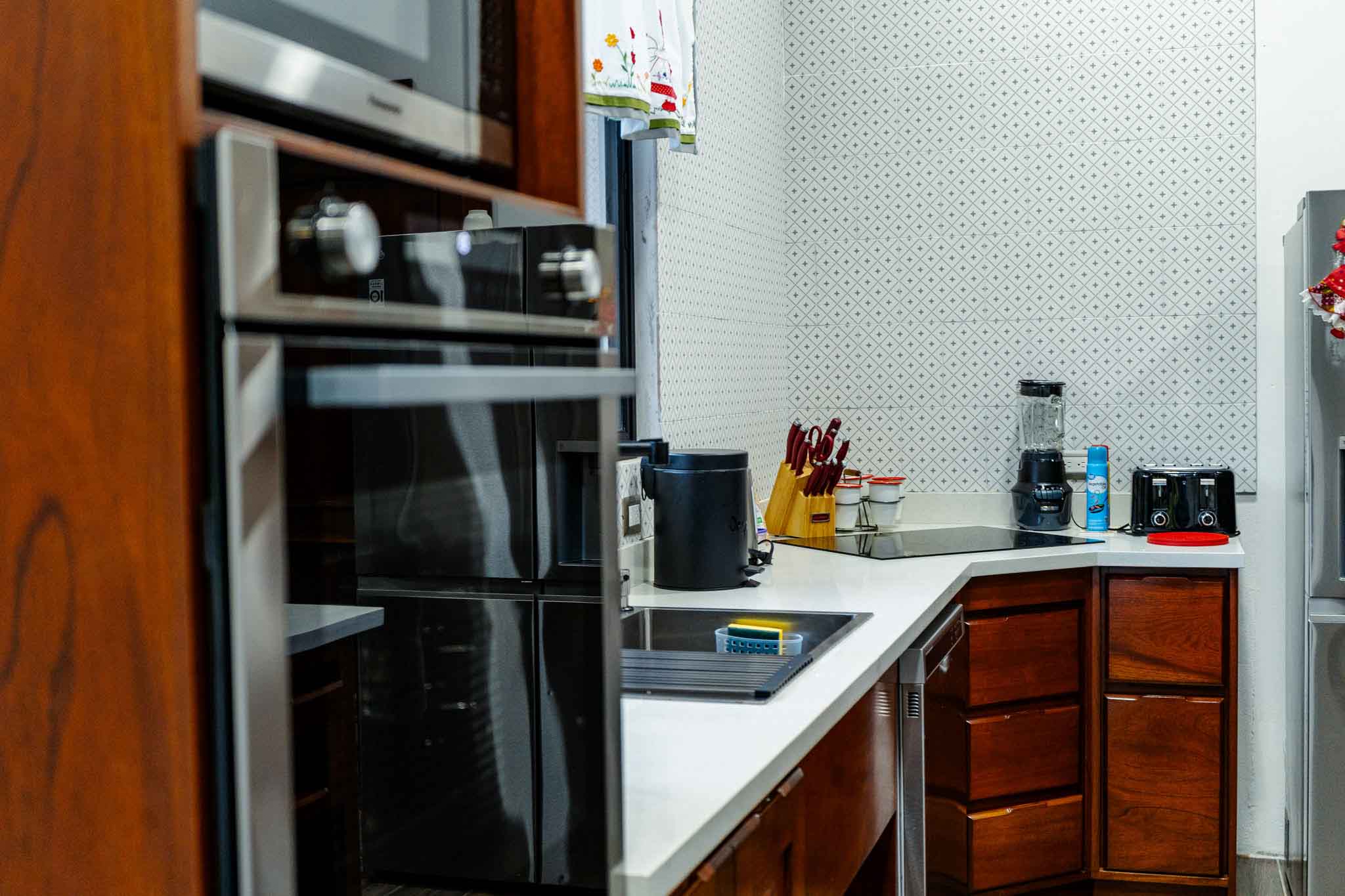 Baking tray. Coffee maker. Coffee. Wine glasses. Kettle. Oven. Dishwasher. Blender. Mini fridge. Plates and cutlery. Refrigerator. High chair. Toaster. Basic cooking utensils. Barbecue utensils